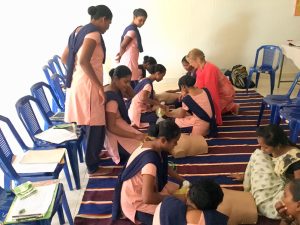“As an AHA BLS instructor, I am aligned with CPR Works of Charlotte. Recently, I traveled to India and obtained dual alignment with an Indian based AHA Training Center in order to train 7 faculty members and 33 third-year nursing students in Basic Life Support for Health Care Providers.  Even though the nursing program adheres to an English medium format, not all the students are fluent in English or easily understand our American English accent. To ensure that the AHA BLS material was comprehended, I first taught the faculty with a 1:4 instructor-participant ratio following the AHA guidelines. The small class size allowed me the opportunity to carefully assess the faculty member’s level of comprehension and identify two assistants from within the faculty. We then assembled the student body and previewed the AHA BLS video while providing corresponding demonstration and translation to provide the students with an overview of the course. Over the following week, I taught the AHA BLS program to the students in groups of 6 or 8 with the help of the assistant faculty being careful to tailor the pace of each class to the students and provide ample time for translation of the material into their native languages. By the end of each training session, I felt confident that the students could perform CPR in a real life setting.